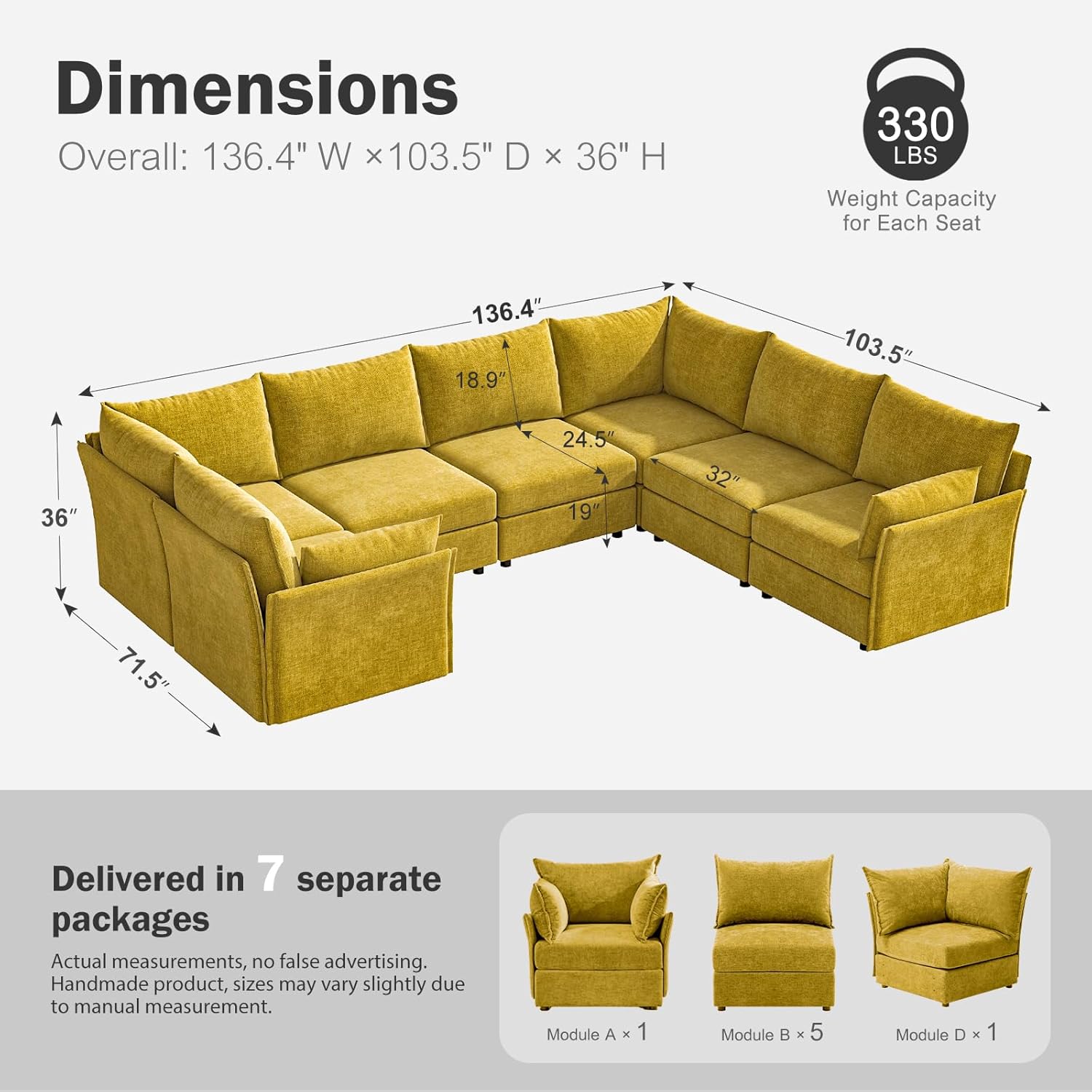 - 💡 Stylish and Spacious Sectional Sofa - A blend of modern elegance and comfort, this yellow sofa is ideal for contemporary interiors. Customize seating and shape by adding or removing modules to fit your needs. It's perfect for your living room, family room, bedroom, or office. Overall size: 136.4" W × 103.5" D × 36" H, seat width: 32", seat depth: 24.5".