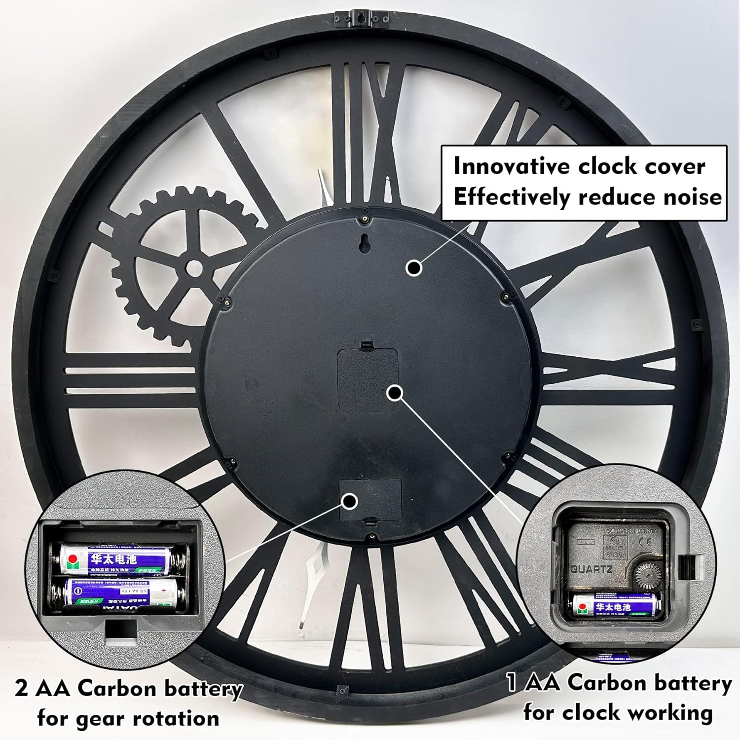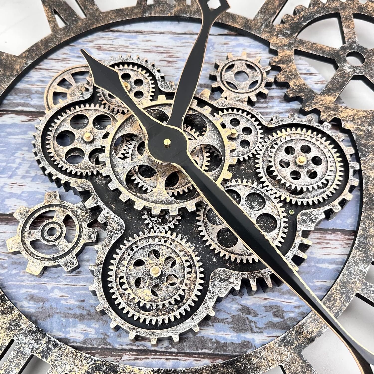 - REAL MOVING GEARS: Large wall clock with unique moving parts is as attractive as it is functional. Put batteries in, various gears start rotating fluently. Moving gear wall clock is amazing looking on the wall and will get so many compliments on it. Made from solid wood and painted by Rust-like color on wall clock create a very rustic and industrial atmosphere. Farmhouse wall clock is professionally handmade and pursuit of naturalness, so it may have some little imperfections.