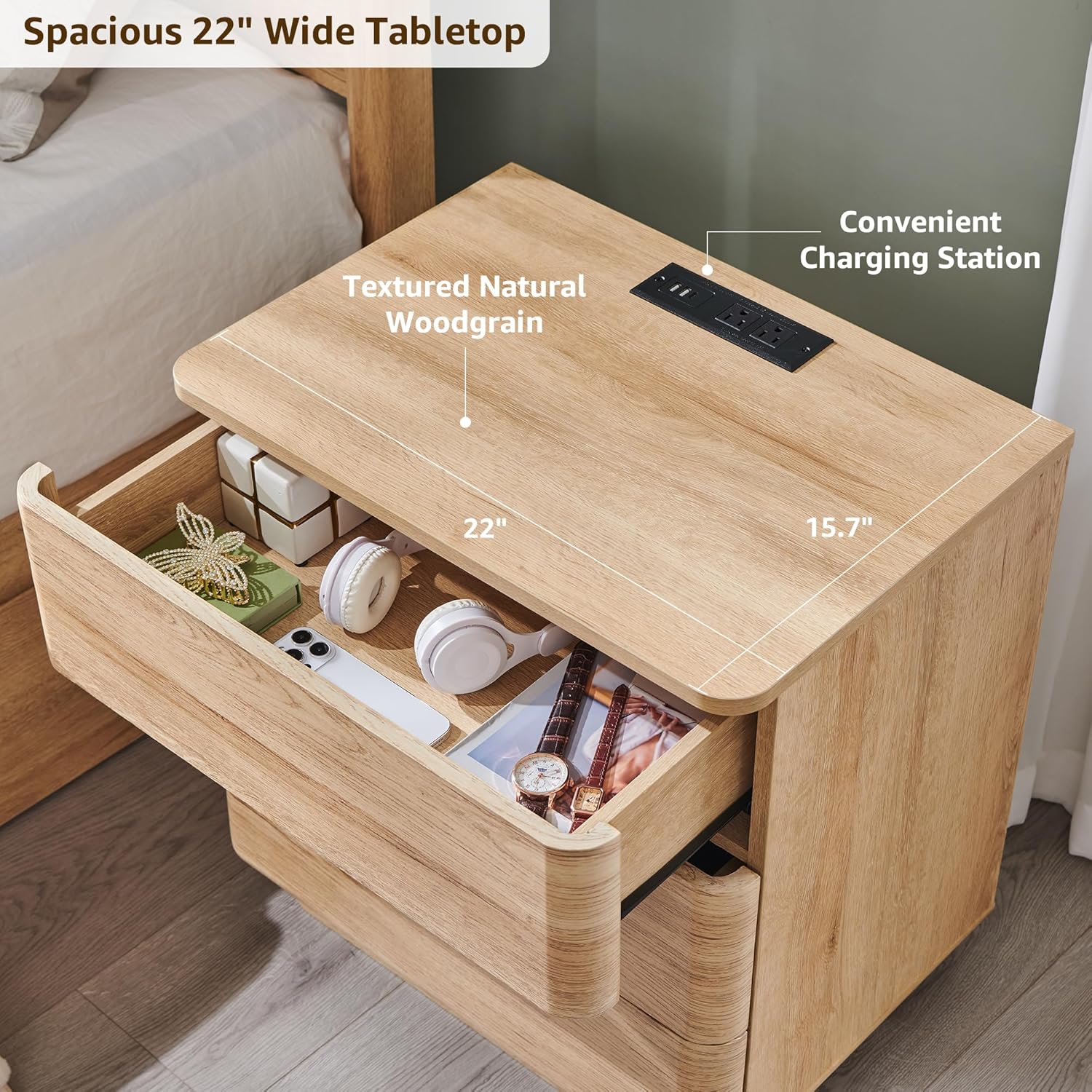 JXQTLINGMU 22" Modern Nightstand Set of 2 with Charging Station, Large Push-to-Open End Table, Wood Bedside Table, Curved Profile, Handleless 3 Drawer Night Stand for Bedroom, Living Room, Natural Oak