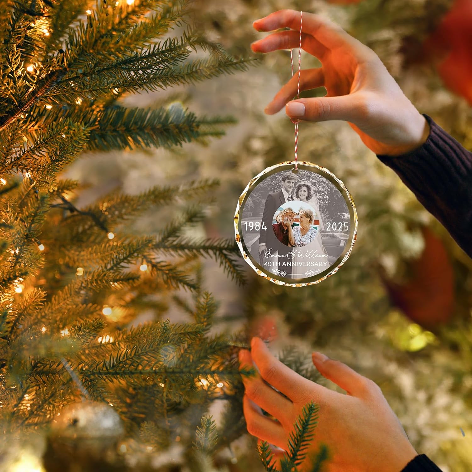 - 🎄️Versatile Christmas Decorations for Every Space 🎄️ Shine bright this holiday with this crystal custom ornament! Provided with two hanging cords in red and white to fit any decor styles, this custom christmas ornament for couples is easy and versatile to display on your Christmas tree, mantles, door, window, wall, or anywhere. The premium crystal material creates rainbow reflections when light hits it, making your tree glow like never before
